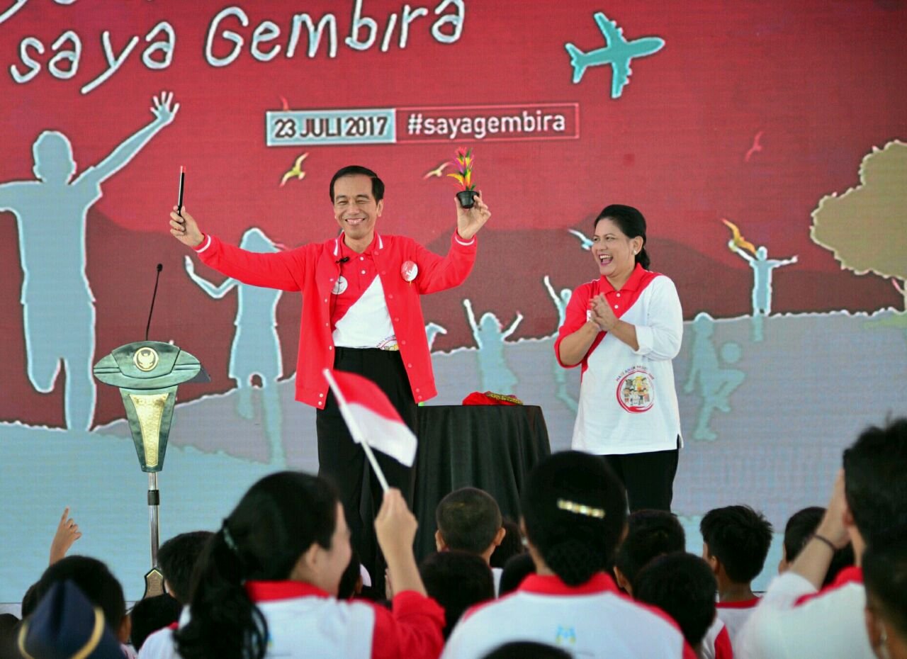 “Anak-anakku siapa yang senang bermain media sosial? Coba ada yang mau bertanya silakan maju ke sini,” tanya Presiden dalam peringatan Hari Anak Nasional 2017 di Lapangan Gedung Daerah Pauhjanggi Provinsi Riau, Minggu (23/7/17).