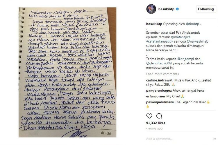 BENDERRAnews, 31/8/17 (Jakarta): Mantan Gubernur DKI Jakarta Basuki Tjahaja Purnama memuat postingan baru di akun instagram, berisi foto tulisan Basuki atau Ahok, Kamis (31/8/17). Foto surat itu diunggah oleh @timbtp.