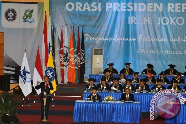Presiden Joko Widodo menyindir lulusan Institut Pertanian Bogor (IPB) yang tidak bekerja di sektor pertanian saat berpidato dalam acara dies natalis institut di Kampus Dramaga, Bogor, Rabu.