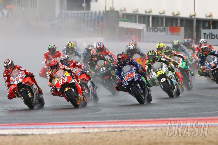 Kondisi lintasan di Twin Ring Motegi yang basah menyebabkan beberapa pebalap terjatuh. Sesi latihan bebas pertama Jorge Lorenzo dan Cal Crutchlow.