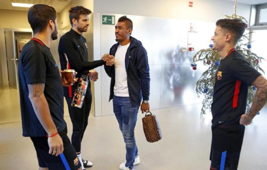 Terlihat Coutinho bertemu dengan Paulinho dan juga bek Gerard Pique di markas latihan tim di Sant-Joa Despi.
