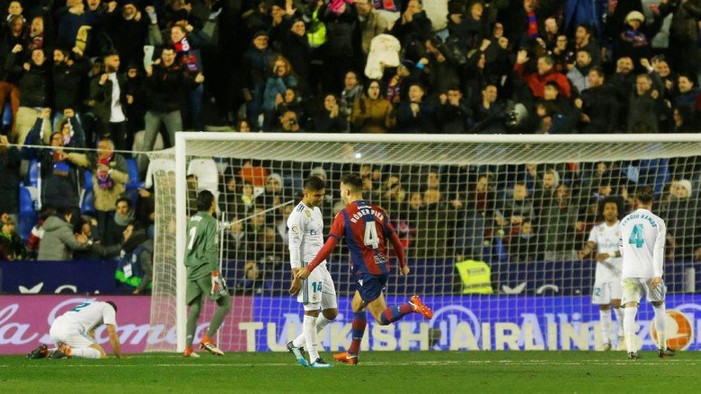 Madrid diimbangi Levante 2-2 meski selalu unggul lebih dulu dalam pertandingan di Estadio Ciudad de Valencia, Minggu (4/2/18) dini hari WIB. Memimpin kedudukan 1-0 lewat tandukan Sergio Ramos, namun Madrid kemudian diimbangi Levante lewat gol Emmanuel Boateng. Kembali unggul 2-1 lewat Isco, gawang Keylor Navas kembali kebobolan oleh gol Giampaolo Pazzini.