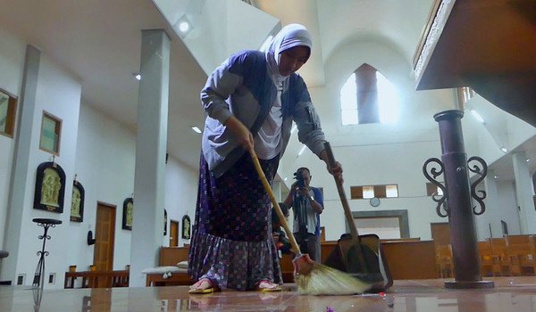 Ibu rumah tangga datang pagi-pagi, Senin (12/2/18) dan langsung bergabung bersama umat Katolik setempat untuk membersihkan Gereja.