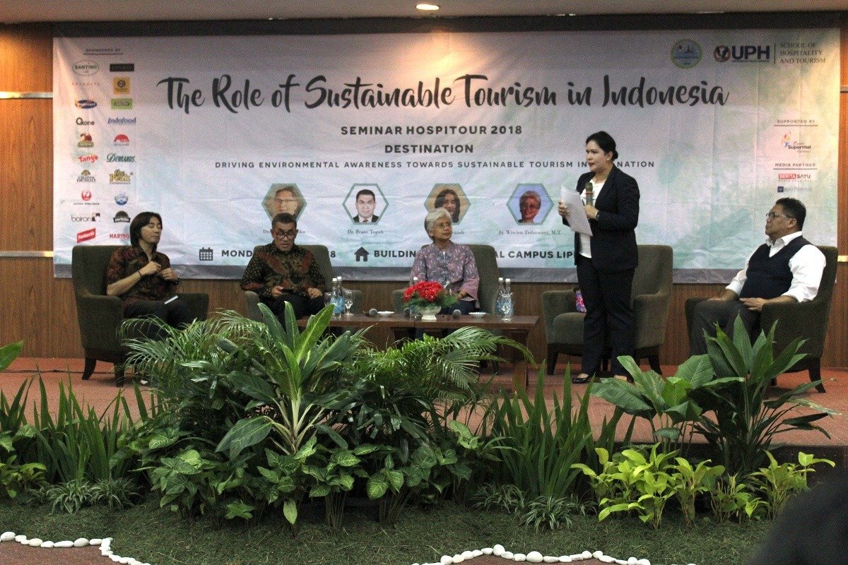 BENDERRAnews, 11/4/18 (Lippo Village): Mengusung dan memilih tema ‘Destinations’ yang merupakan kepanjangan dari Driving Environmental Awareness towards Sustainable Tourism for Our Nation, digelarlah Seminar Nasional tentang Kepariwisataan, pada 9 April 2018 di Gedung D ruang 502 UPH, kawasan Lippo Village, Karawaci, Tangerang, Banten.