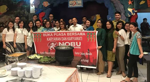 “Di bulan yang penuh rahmat ini, Bank Nobu menggelar buka puasa bersama karyawan dan karyawati Bank Nobu, baik yang ada di Kantor Wilayah Indonesia Timur, Kantor Cabang Manado, Kantor Kas Calaca dan Kantor Kas Lippo Plaza Kairagi, bertempat di Restoran Big Fish pada hari Jumat 8 Juni 2018, pukul 18.00 Wita,” ungkap Kacab Bank Nobu Manado, Aneke Mapasa, seperti di eritakan BeritaManado.com, Sabtu (9/6/18).