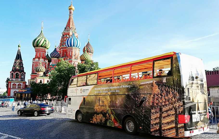 Berdasarkan siaran pers Kedutaan Besar RI (KBRI) Moskow yang diterima di Jakarta, Senin (4/6/18) lalu, disebutkan, bus bergambar Candi Borobudur dengan logo “Wonderful Indonesia” dan “Asian Games 2018 Jakarta-Palembang” itu mengaspal serta menelusuri jalan-jalan utama di Ibu Kota Rusia ini mulai 1 Juni hingga 20 Juni 2018.