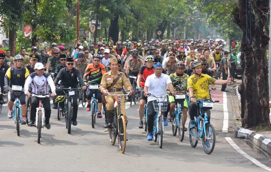 Di belakang Jokowi, ribuan warga mengikuti kegiatan sepeda bersama tersebut yang bertema “Bandung Lautan Sepeda” di Bandung, Jawa Barat, Sabtu (10/11/18).