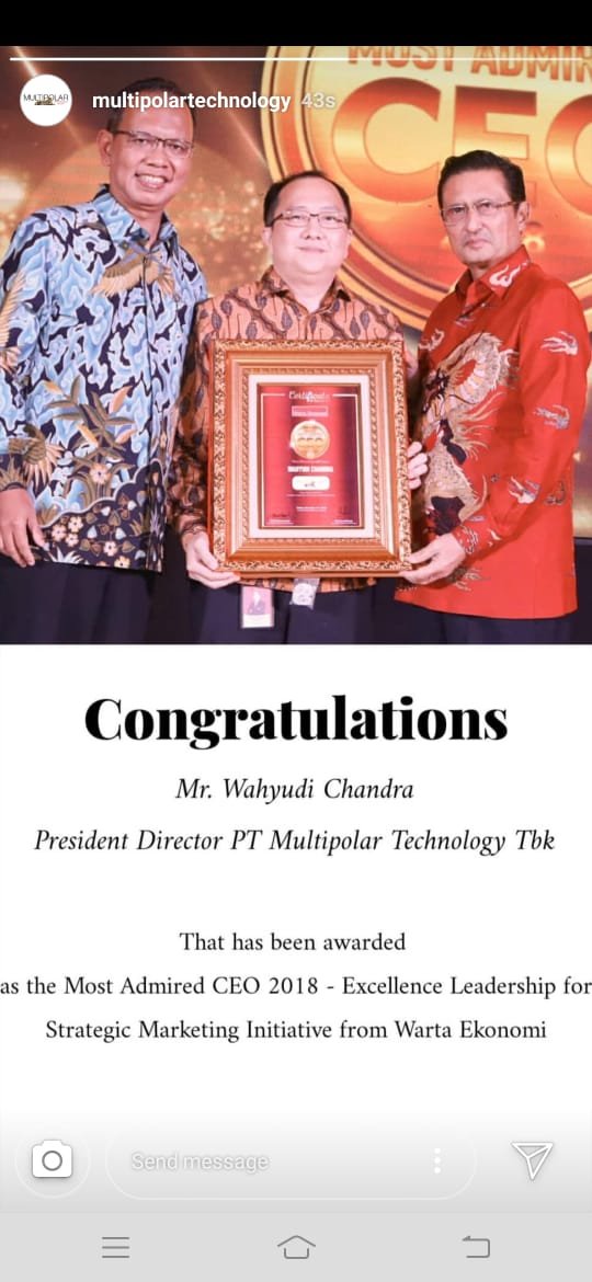 Terpilih !!! CEO PT Multipolar Technology terima penghargaan ‘Most Admired CEO 2018’, menjadi ‘CEO Idaman’