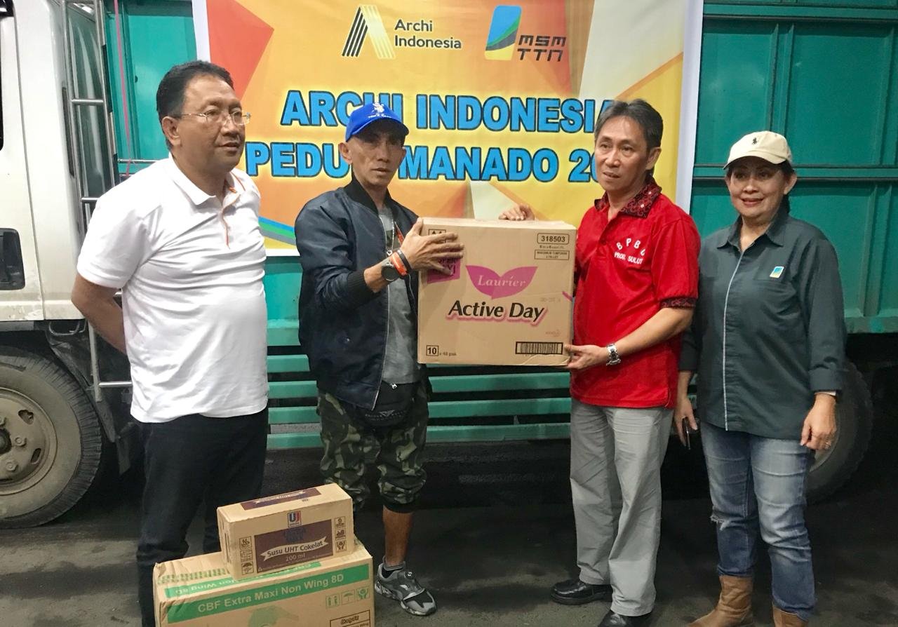 BENDERRAnews, 3/1/19 (Manado): Archi Indonesia kembali tunjukkan totalitas aksinya peduli terhadap warga terdampak bencana, antara lain lewat aksi konkret menyalurkan bantuan natura sesuai kebutuhan, sebagaimana dilakukannya kepada korban banjir dan tanah longsor di Manado, Sulawesi Utara.