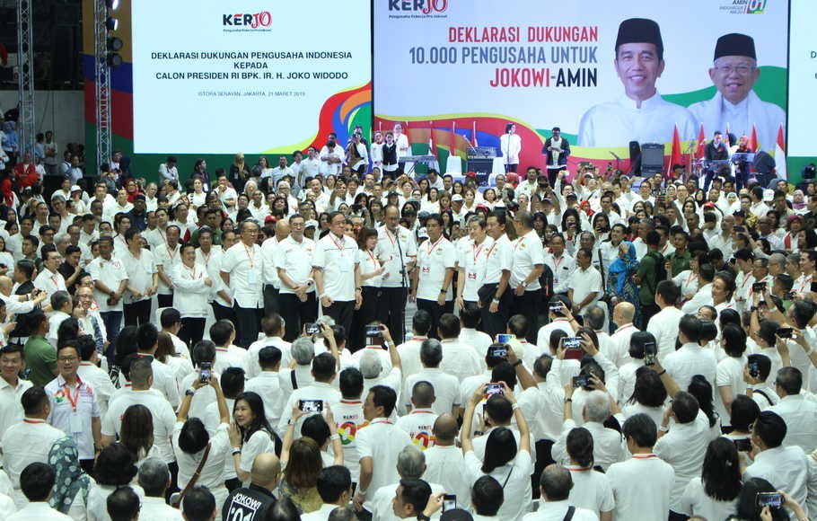 Nah, hari Kamis (21/3/19) ini, Presiden RI Joko Widodo didampingi para pengusaha dari Kadin Indonesia, Apindo, Iwapi hadir di “Deklarasi 10.000 Pengusaha untuk Jokowi-Amin” di Istora Gelora Bung Karno, Jakarta.