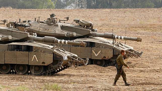 Tentara Israel berjalan melewati tank di dekat perbatasan Gaza-Israel, Jumat (19/10). Pengerahan itu disebut menjadi yang terbesar sejak perang 2014. (JACK GUEZ/AFP)
