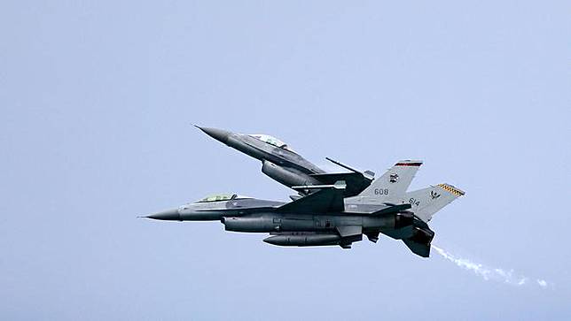 Aksi dua jet tempur F-16 Angkatan Udara Singapura melakukan manuver di udara jelang Singapore Airshow 2018, Jumat (2/2) . Singapore Airshow 2018 akan dihadiri delegasi pemerintah dan militer tingkat tinggi dari seluruh dunia. (AP Photo/Wong Maye-E)