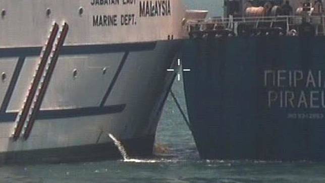 Kapal pemerintah Malaysia, Polaris, bertabrakan dengan kapal dagang berbendera Yunani di lepas pantai Tuas, Singapura, Sabtu 9 Februari 2019 (AFP/Singapore Police Force)