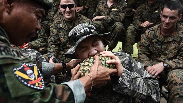 Sersan Mayor Marinir Thailand Chaiwat Ladsin, memegang nanas yang digigit oleh anggota marinir Korea Selatan saat latihan gabungan Cobra Gold antara militer AS dan Thailand di Chonburi, Thailand (19/2). (AFP Photo/Lilian Suwanrumpha)