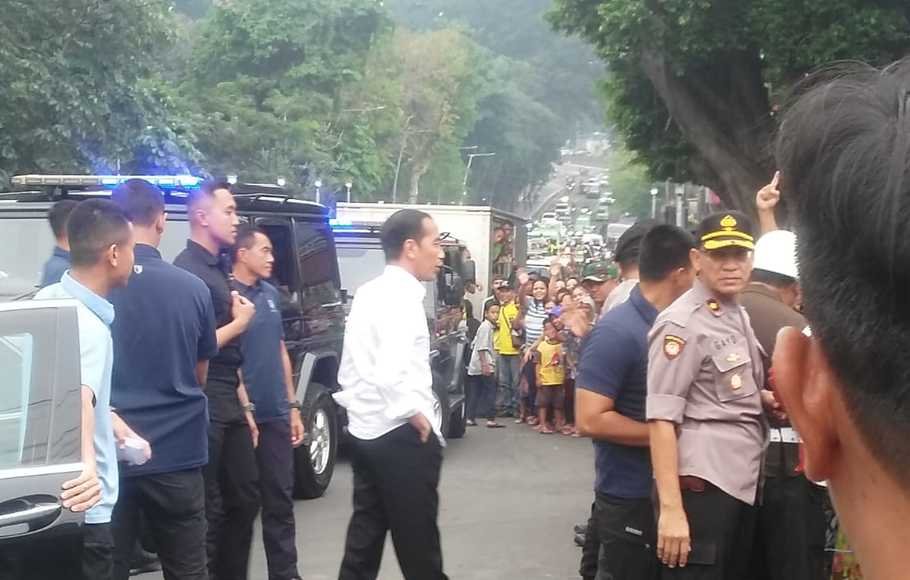 Presiden Jokowi tiba di lokasi menggunakan mobil Mercedes-Benz berpelat nomor B 1197 RFS pada pukul 16.25 WIB dengan pengawalan ketat dari Pasukan Pengamanan Presiden (Paspampres). Jokowi tampak mengenakan kemeja berwarna putih berkerah di lengkapi dengan celana bahan berwarna hitam.