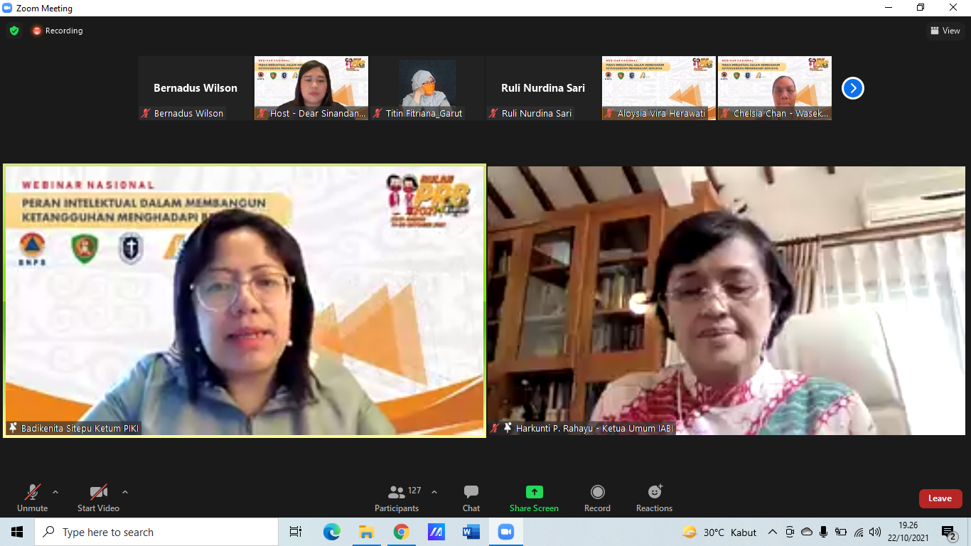 BENDERRANews.com, 23/10/2021 Jakarta – Memperingati Bulan Pengurangan Risiko Bencana 2021, Dewan Pimpinan Pusat Persatuan Inteligensia Kristen Indonesia (PIKI) bekerjasama dengan Ikatan Ahli Kebencanaan Indonesia (IABI) mengadakan webinar yang sejalan dengan tema besar bulan PRB 2021 yaitu “PERAN INTELEKTUAL DALAM MEMBANGUN KETANGGUHAN MENGHADAPI BENCANA”.